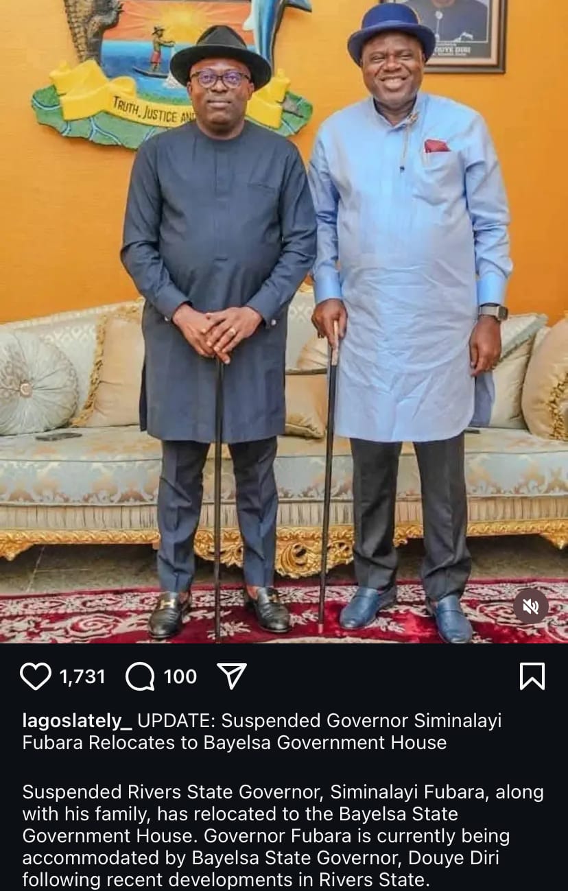 Embattled Rivers State Governor, Siminalayi Fubara, has reportedly relocated to the Bayelsa State Government House following his removal from office.