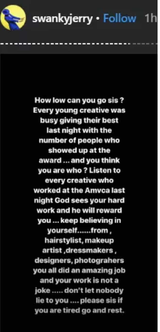 “How low can you go sis? Every young creative was busy giving their best last night with the number of people who showed up at the award… and you think you are who? Listen to every creative who worked at the AMVCA last night God sees your hard work and he will reward you…