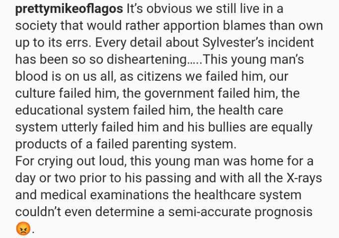 “It’s obvious we still live in a society that would rather apportion blames than own up to its errs. Every detail about Sylvester’s incident has been so so disheartening…..This young man’s blood is on us all, as citizens we failed him, our culture failed him, the government failed him, the educational system failed him, the health care system utterly failed him and his bullies are equally products of a failed parenting system.