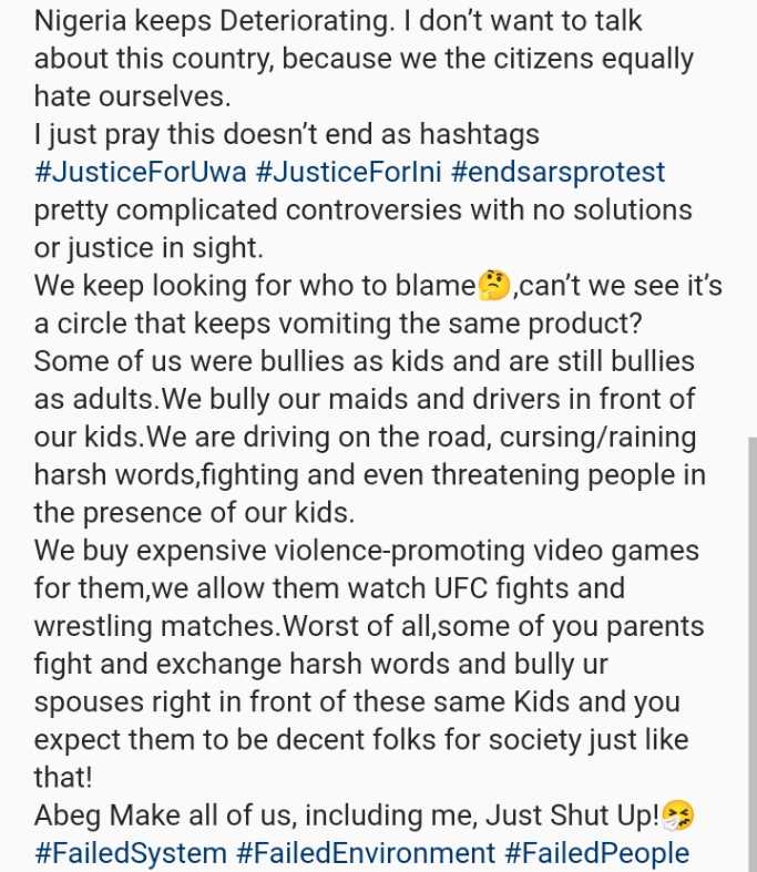 Taking to his Instagram page, he expressed his disappointment in the Nigerian system, especially the health care system who should have prevented his untimely death.
