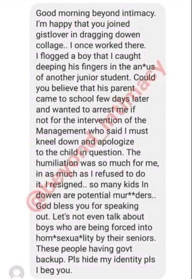 The humiliation was so much for me, in as much as I refused to do it. I resigned….so many kids in Dowen are potential murderers. God bless you for speaking out. Let’s not even talk about boys who are being forced into homosexuality by their seniors. These people having govt backup. Pls hide my identity pls. I beg you,” he discreetly share to Beyond Intimacy.