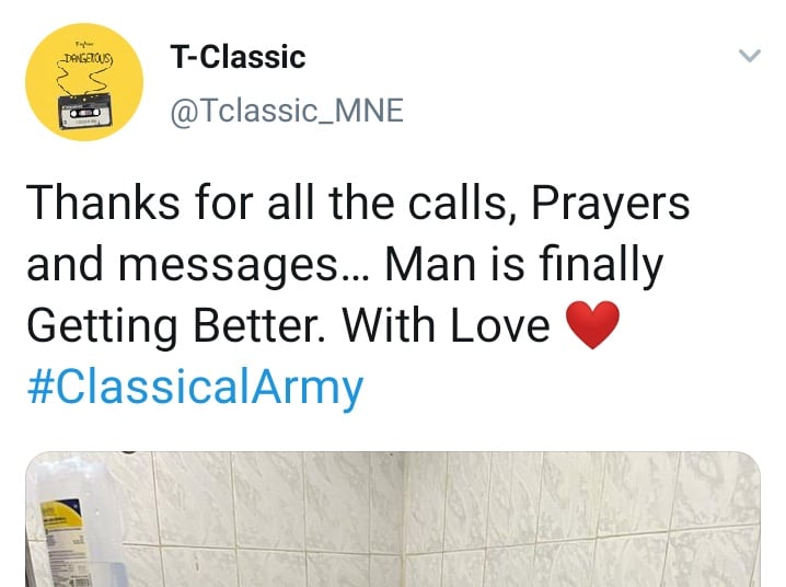 He wrote: “Thanks for all the calls, Prayers and messages… Man is finally Getting Better. With Love ❤️ #ClassicalArmy.”