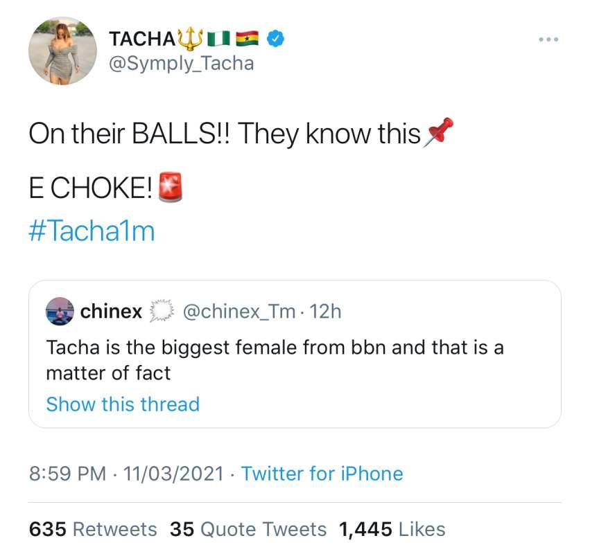 Popular brand influencer, Tacha Akide is celebrating a milestone as she hits a whopping 1 million followers on the micro-blogging platform, Twitter.