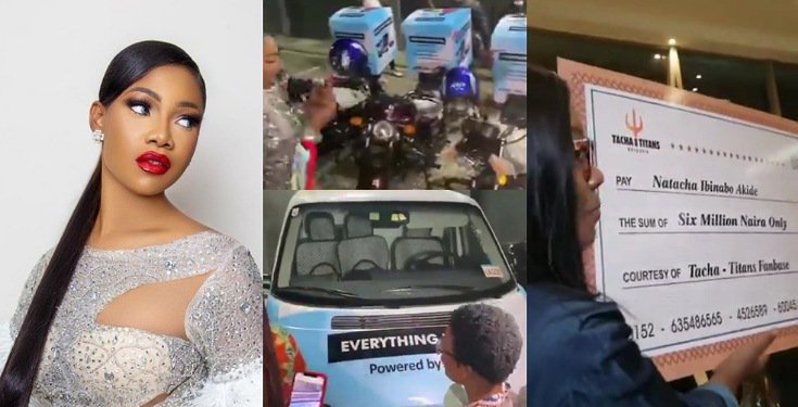 It was an emotional moment for ex-BBNaija housemate, Tacha when she teared up after receiving N6m cash, a delivery bus and 3 delivery bikes as birthday gifts from her fans, the Titans.