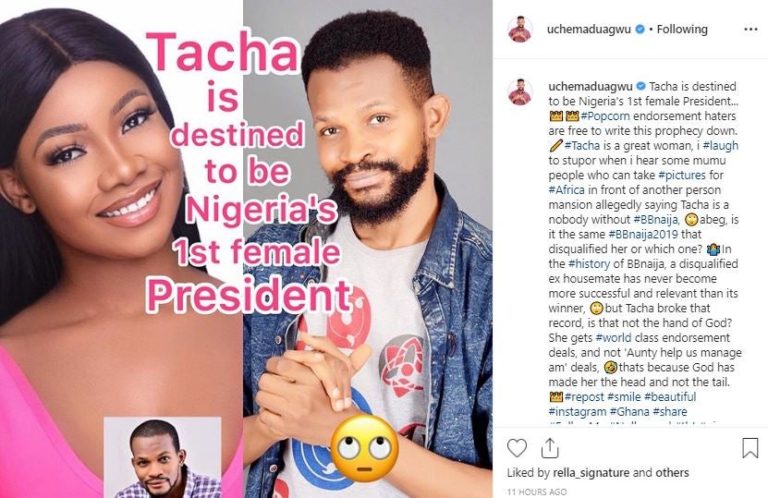 “Tacha is destined to be Nigeria’s 1st female President… #Popcorn endorsement haters are free to write this prophecy down. #Tacha is a great woman, I #laugh to stupor when I hear some mumu people who can take #pictures for #Africa in front of another person mansion allegedly saying Tacha is a nobody without #BBNaija, abeg, is it the same #BBnaija2019 that disqualified her or which one?”