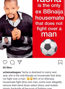 “Tacha is destined to marry next year, she is the only bbnaija ex-housemate that does not fight over a man. ??98% of ex #bbnaija housemate fight dirty over men, some even allegedly remove their bend down select dress, and mobile plastic backside all because of fighting over someone else’s man, ?but you will never see #Tacha doing that nonsense because she is not a spiritual local champion like all the other ex-housemate who do such.