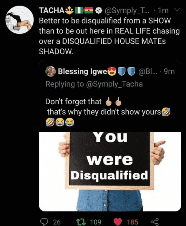 According to her, she participated, but for some reason it was not shown. A fan of another housemate then mocked her saying it was because she was disqualified. Read Tacha’s reply below….