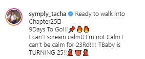 “Ready to walk into Chapter25? 9Days To Go!!!??? I can’t scream calm!! I’m not Calm I can’t be calm for 23Rd!!!! TBaby is TURNING 25!!?????.”