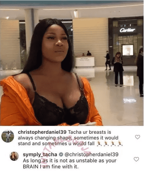 The Instagram user, identified as “Christopherdaniel39” pointed out that Tacha’s breast is confusing as it appears fallen at some point and firm at another point. Responding to that, Tacha hit heavy on him as she pointed out that “Christopherdaniel39” has an unstable brain.