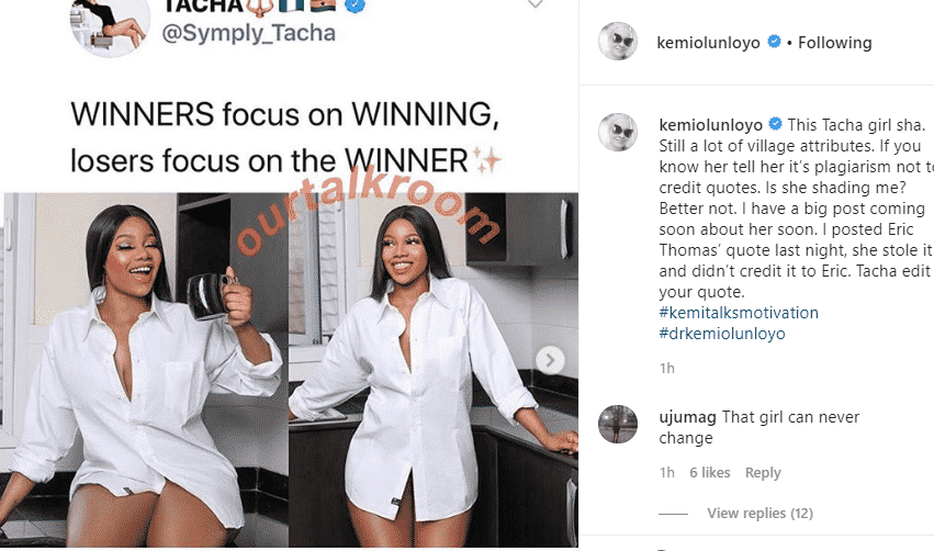 “This Tacha girl sha. Still a lot of village attributes. If you know her tell her it’s plagiarism not to credit quotes. Is she shading me? Better not. I have a big post coming soon about her soon. I posted Eric Thomas’ quote last night, she stole it and didn’t credit it to Eric. Tacha edit your quote.”