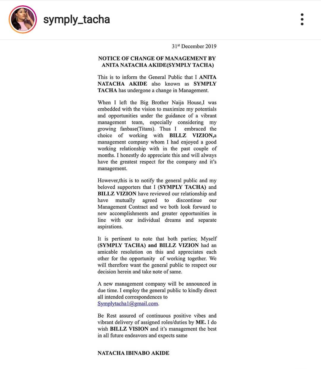 Speaking on the development, the reality star, through a notice which she released on her verified instagram page, noted that she had an amicable relationship with her ex management team, but they both decided to discontinue the relationship, as they look forward to greater opportunities in line with their individual aspirations.