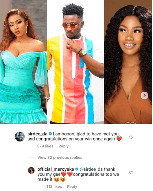 There are rumours that her unfollowing him could be related to the fact that Sir Dee congratulated Mercy Eke recently on her Instagram page. See the message below…