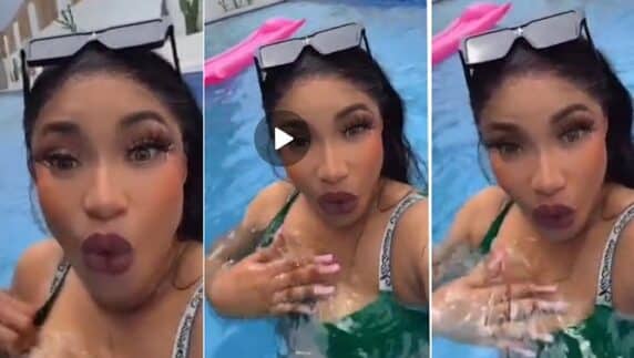 Embarrassing moment Tonto Dikeh exposed her nip while swimming in bikini (Video)