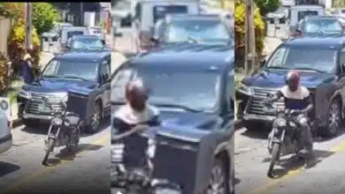 Dispatch rider almost crushed by truck while collecting money from Naira Marley (Video)