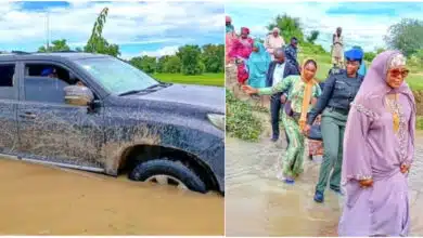 Bauchi State’s First Lady, Hajiya Aisha Bala Muhammad, was forced to traverse flooded terrain on foot after her convoy got…