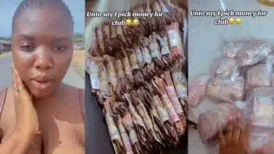 A beautiful Nigerian lady is causing a stir as she shows off bundles and wraps of 100 naira notes she…