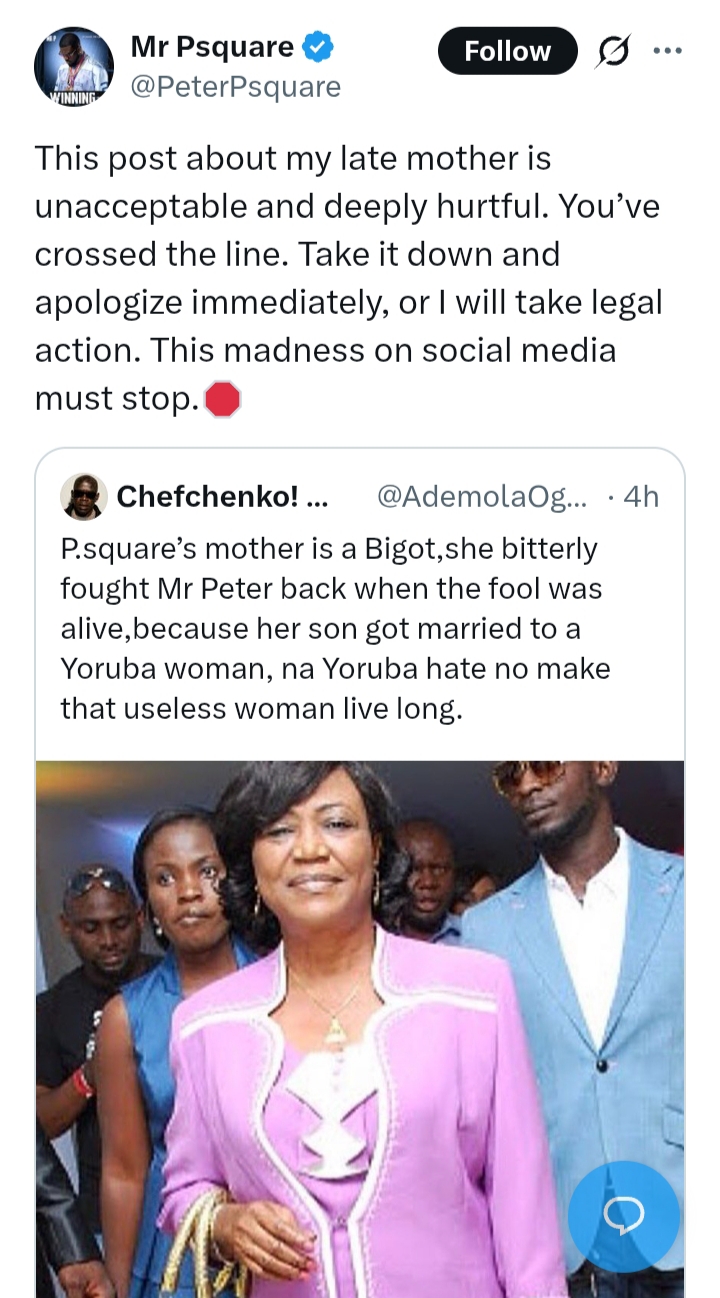 “Take it down and apologize immediately, or…” – Peter Okoye threatens legal action over offensive post about late mother
