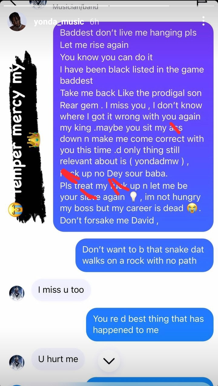 The musician took to social media to share a conversation he had with the Afrobeats star where he begged to be given another chance.