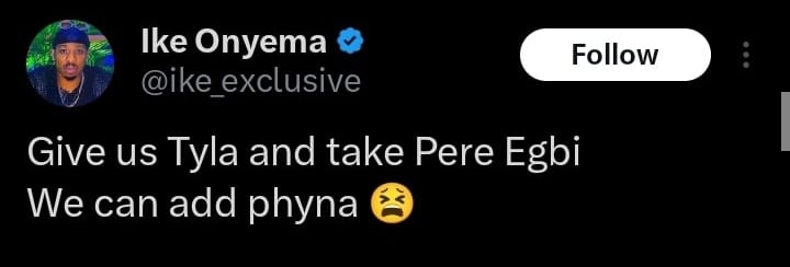 “Give us Tyla and take Pere Egbi. We can add Phyna,” he wrote.