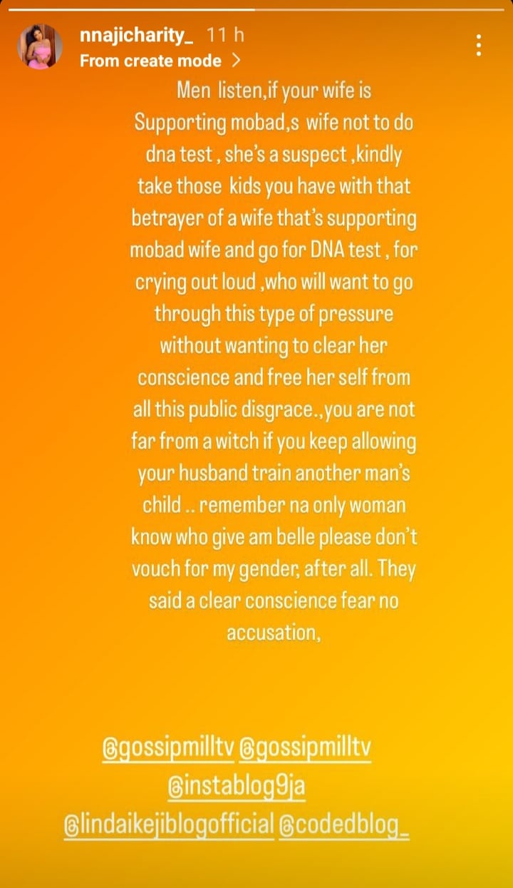 “Men listen, if your wife is Supporting mobad,s wife not to do dna test , she’s a suspect , kindly take those kids you have with that betrayer of awife that’s supporting mobad wife and go for DNA test , for crying out loud ,who will want to go through this type of pressure without wanting to clear her conscience and free her self from all this public disgrace.,you are not far from a witch if you keep allowing your husband train another man’s child .. remember na only woman know who give am belle please don’t vouch for my gender, after all. They said a clear conscience fear no accusation”