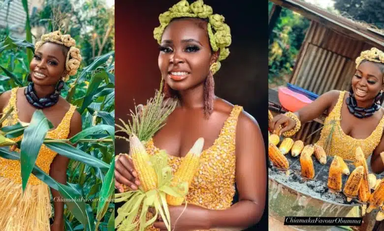 A talented Nigerian lady named Chiamaka Favour Obumma recently posted photos on her Facebook page showing a dress she crafted using maize seeds and silk.