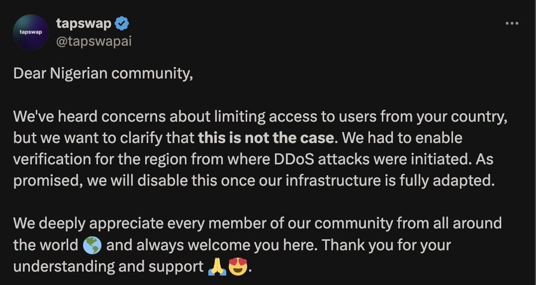 “Dear Nigerian community. We’ve heard concerns about limiting access to users from your country, but we want to clarify that this is not the case. We had to enable verification for the region from where DDoS attacks were initiated.