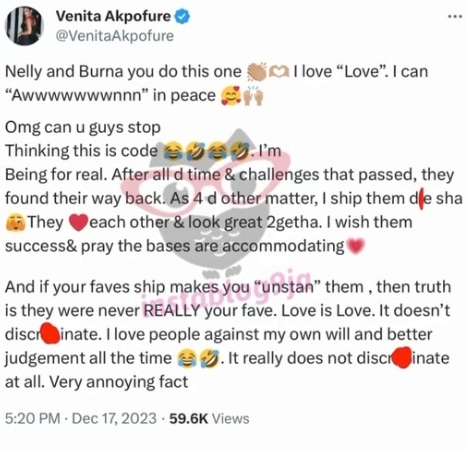 She wrote: “Nelly and Burna you do this one I love “Love”. I can “Awwwwwwwnnn” in peace Omg can u guys stop Thinking this is code. I’m Being for real. After all d time & challenges that passed, they found their way back. As 4 d other matter, I ship them die sha They love each other & look great 2getha. I wish them success& pray the bases are accommodating And if your faves ship makes you “unstan” them, then truth is they were never REALLY your fave. Love is Love. It doesn’t discriminate. I love people against my own will and better judgement all the time. It really does not discriminate at all. Very annoying fact.”