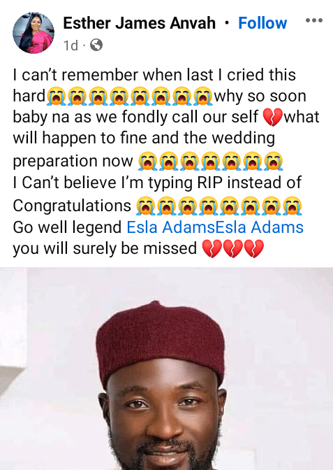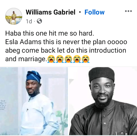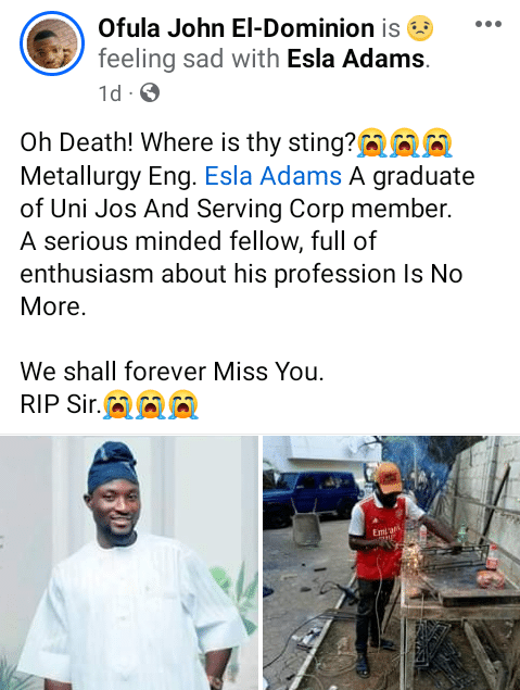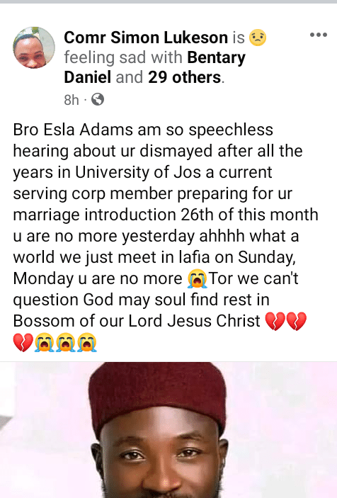 “Bro Esla Adams, I am so speechless hearing about ur demise after all the years in University of Jos a current serving corp member preparing for ur marriage introduction 26th of this month. You are no more yesterday. ahhhh what a world. We just meet in lafia on Sunday, Monday u are no more. Tor we can’t question God. May soul find rest in Bossom of our Lord Jesus Christ,” one Comr Simon Lukeson posted.