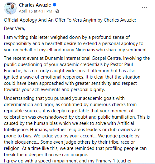 A South Africa-based tech expert, Charles Awuzie apologizes to the NOUN graduate, Anyim Veronica for the embarrassment she faced, as he offers her a sponsorship and cash token.