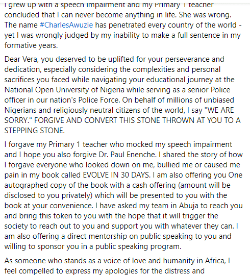 I forgave my Primary 1 teacher who mocked my speech impairment and I hope you also forgive Dr. Paul Enenche. I shared the story of how I forgave everyone who looked down on me, bullied me or caused me pain in my book called EVOLVE IN 30 DAYS. I am also offering you One autographed copy of the book with a cash offering (amount will be disclosed to you privately) which will be presented to you with the book at your convenience. I have asked my team in Abuja to reach you and bring this token to you with the hope that it will trigger the society to reach out to you and support you with whatever they can. I am also offering a direct mentorship on public speaking to you and willing to sponsor you in a public speaking program.