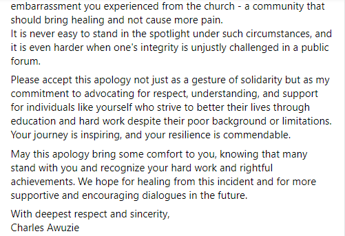 As someone who stands as a voice of love and humanity in Africa, I feel compelled to express my apologies for the distress and embarrassment you experienced from the church – a community that should bring healing and not cause more pain.