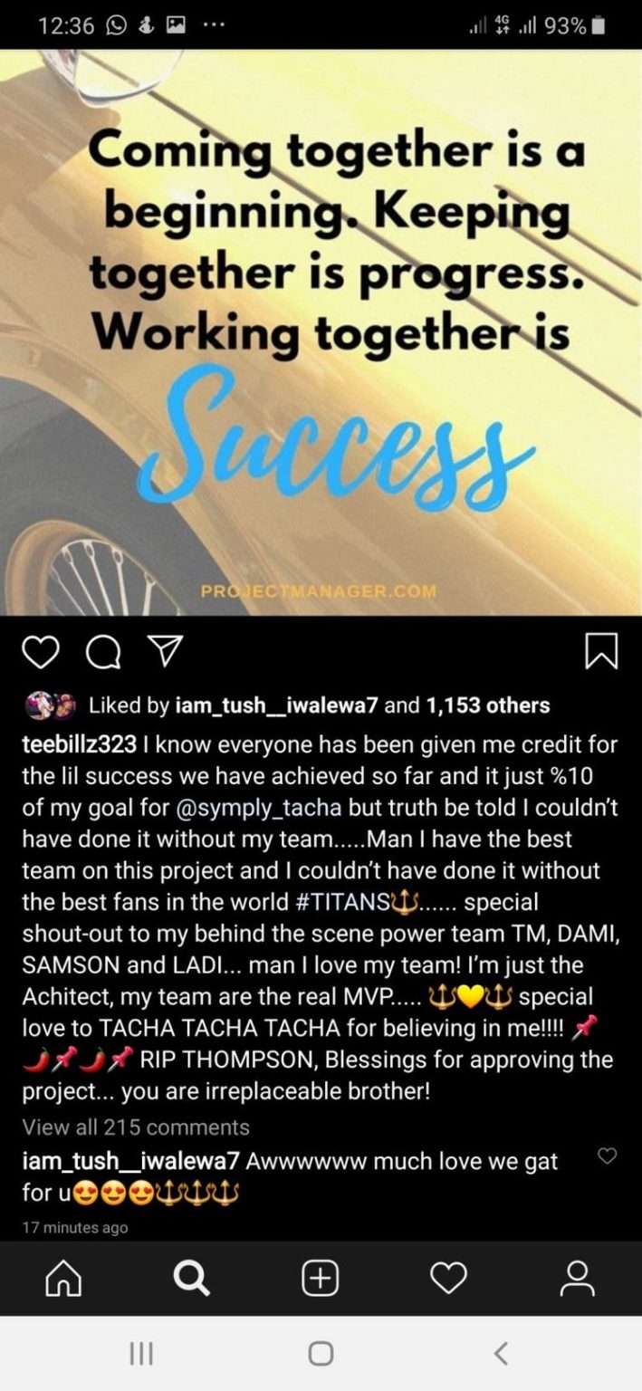 I know everyone has been given me credit for the little success we have achieved so far and it’s just %10 of my Goal/Plans for @symply_tacha but truth be told I couldn’t have done it without my team…..Man I have the best team on this project and I couldn’t have done it without the best Fan base in the world #TITANS?…… special shout-out to my behind the scene power team TM, DAMI, SAMSON and LADI… man!!! I love my team! I’m just the Achitect, my team are the real MVP….. ??? special love to TACHA TACHA TACHA for believing in me!!!! ????? RIP THOMPSON, Blessings for approving the project… you are irreplaceable brother! I’m still tripping how you left me by myself but I can’t be selfish not to let you go in peace……. you told me I’m a ladder that GOD has created for ppl to climb to their success…….. I PROMISE I WILL MAKE YOU PROUD brother! I will change so many lives bro, word on my children….??????