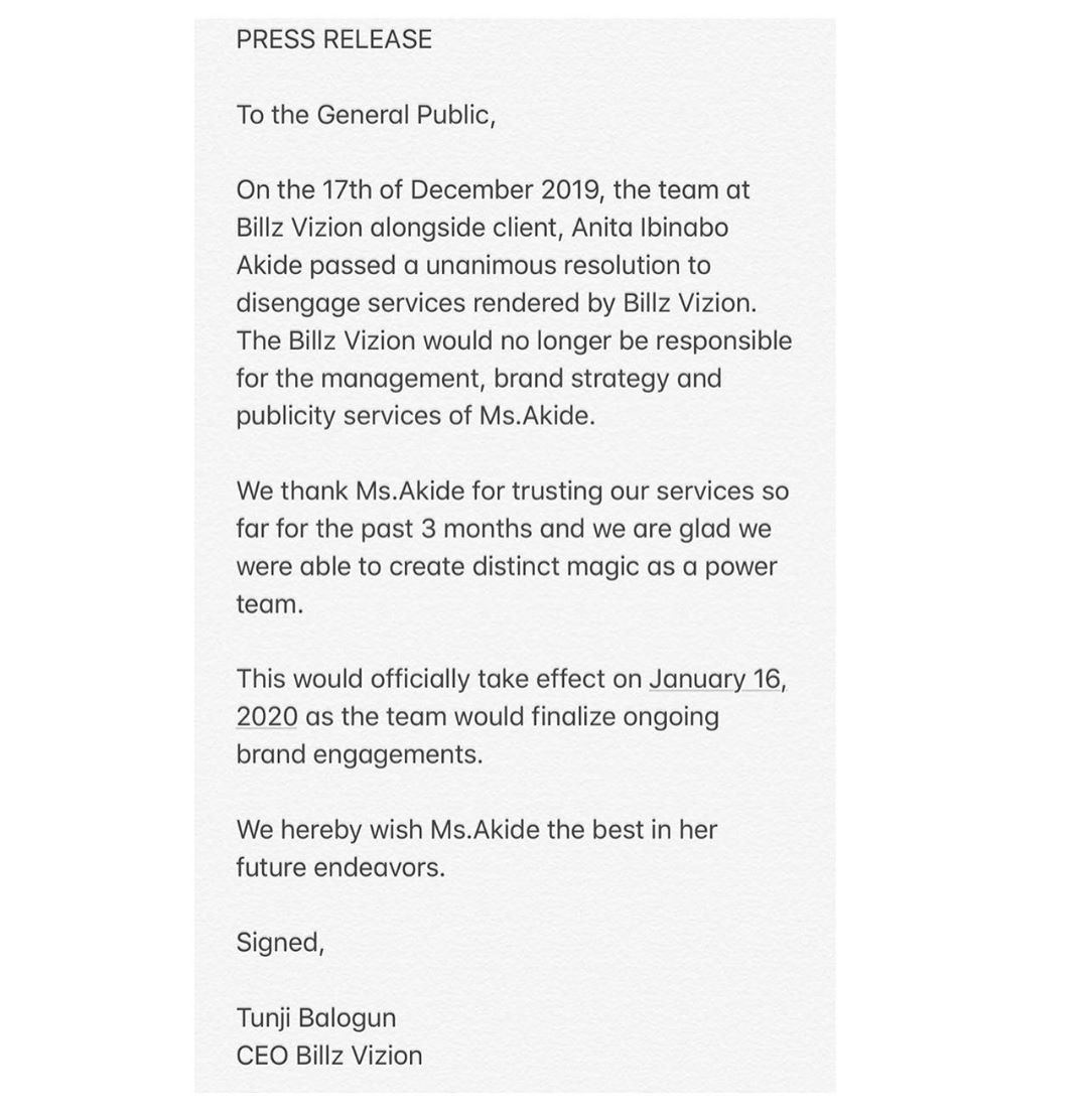 A statement shared by Teebillz noted that a unanimous decision was made on December 17, to disengage services rendered by Billz Vision to Tacha. The management of the company also expressed appreciation to Tacha for trusting their services in the past three months. In conclusion, it was stated that the end of the deal with Tacha is to officially take effect on January 16, 2020.