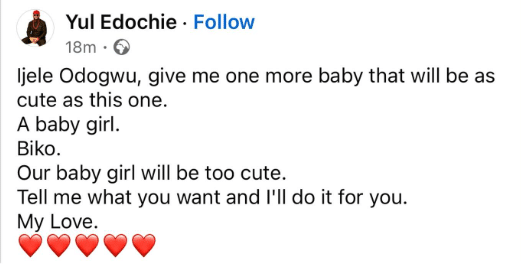 He had taken to his Instagram page to beg her to give him a baby girl, assuring to give her anything that she wanted.
