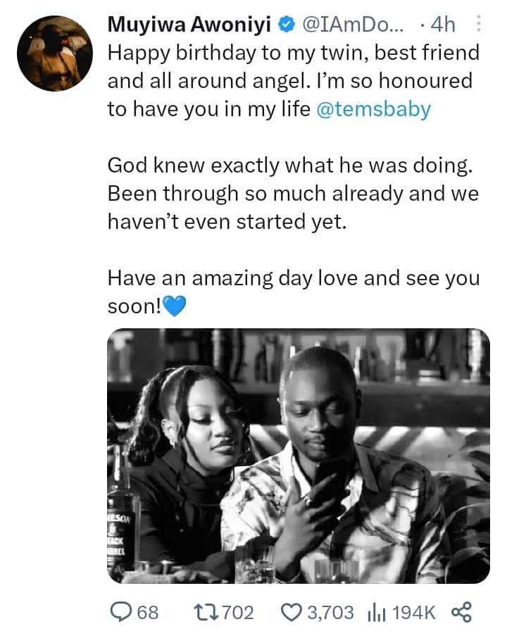 Muyiwa Awoniyi, the manager of sensational Nigerian artist Tems has sparked dating rumor with his birthday message to the singer.