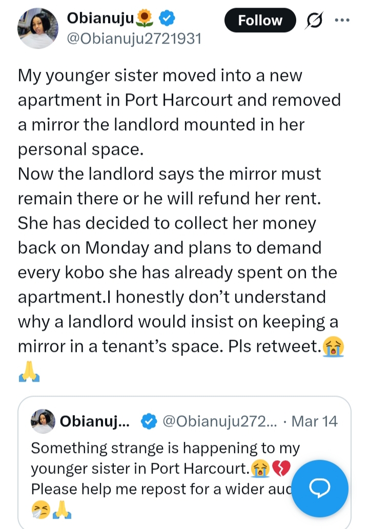 A lady has shared her younger sister’s experience after a disagreement with a landlord over a mirror installed inside her apartment in Port Harcourt.