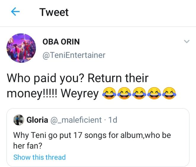 “Why Teni go put 17 songs for album,who be her fan?”, the troll tweeted.