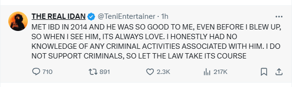 In response, Teni stated on Sunday morning that she was unaware of any illegal activity linked to IBD Dende. She also mentioned that the businessman had been courteous to her in 2014, before she became well-known, and that she had always held him in the highest regard.