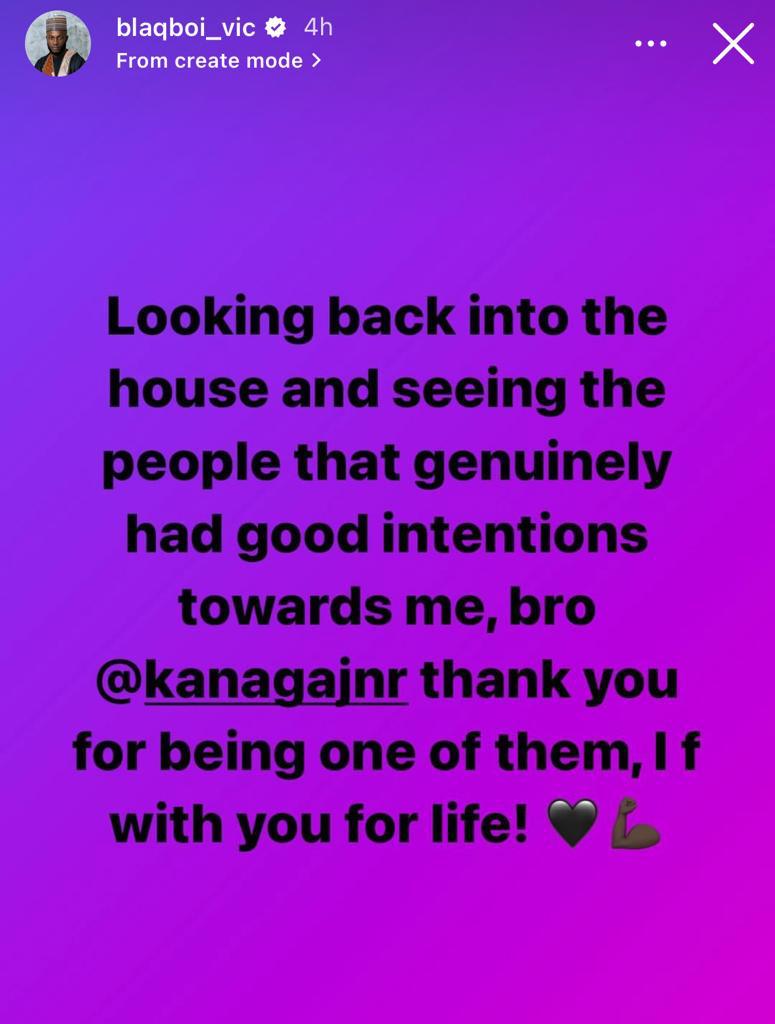 “Looking back into the house and seeing the people that genuinely had good intentions towards me, bro @kanagajnr thank you for being one of them, I f with you for life!”