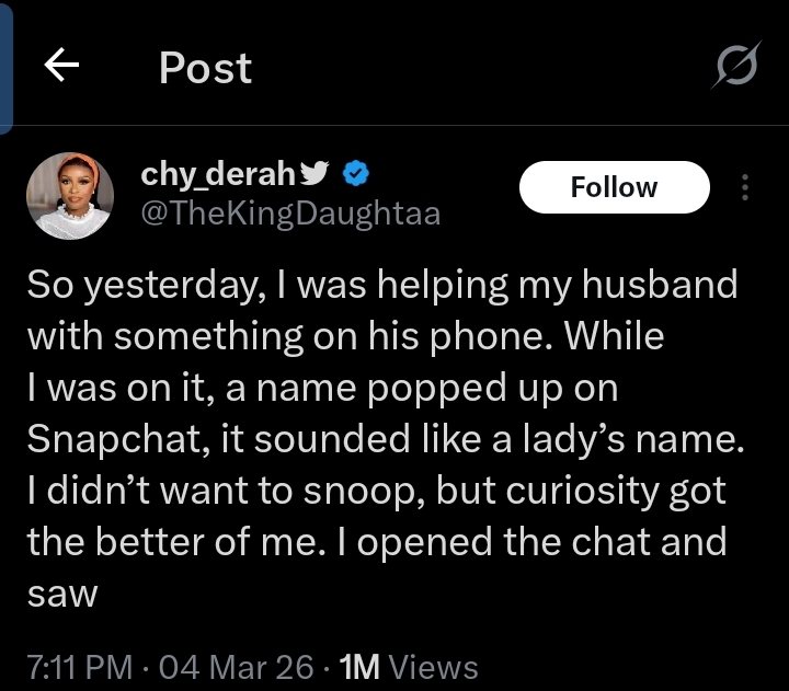 While checking her husband’s chat, she discovered he had shared his city of residence with the lady and even admitted he was surprised she was single