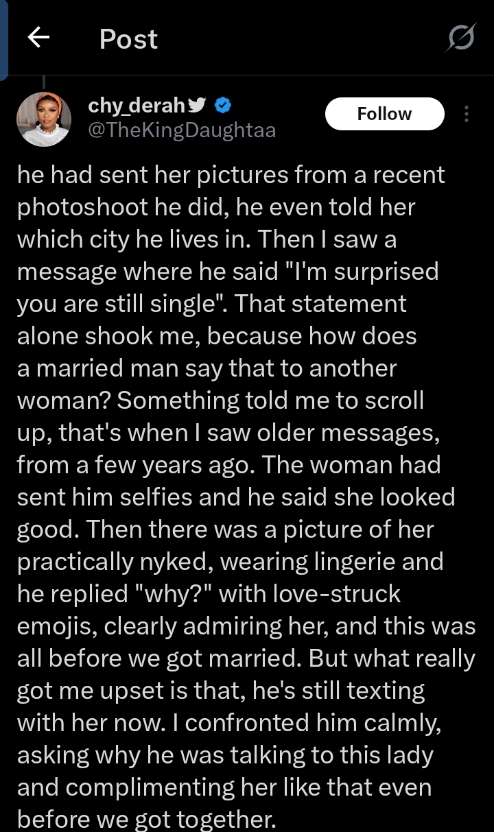 ”Then I saw a message where he said “I’m surprised you are still single”. That statement alone shook me, because how does a married man say that to another woman?”, The tweet reads in part.