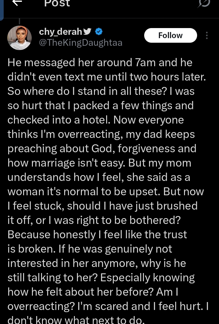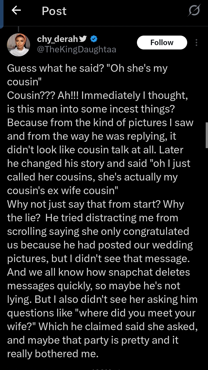 Sharing how she handled the situation, the X user narrated, “I confronted him calmly, asking why he was talking to this lady and complimenting her like that even before we got together.Guess what he said? “Oh she’s my cousin” Cousin??? Ah!!! Immediately I thought, is this man into some incest things? Later he changed his story and said “oh I just called her cousins, she’s actually my cousin’s ex wife cousin”