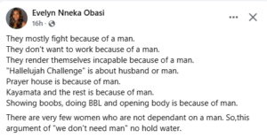 “Hallelujah Challenge” is about husband or man. Prayer house is because of man. Kayamata and the rest is because of man. Showing boobs, doing BBL and opening body is because of man. There are very few women who are not dependent on a man. So, this argument of “we don’t need man” no hold water,” she wrote.
