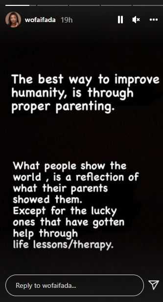 Taking to her Instagram story, Wofaifada stated that good parenting is important to improve humanity as people tend to show the world the exact reflection of what their parents showed them.