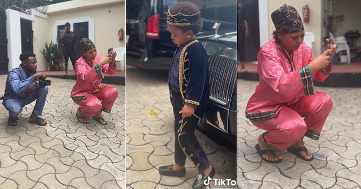 In the video, Regina Daniels bent down to take shots of her son with her phone, while the photographer captured Munir with a professional camera.