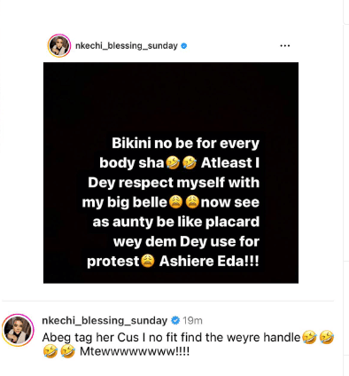 “Bikini no be for every body sha’ Atleast I Dey respect myself with my big belle’ now see as aunty be like placard wey dem Dey use for proteste Ashiere Eda!!!
