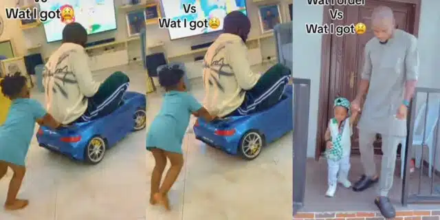 In an adorable video that has stirred reactions, a father rides on his son’s small toy car as the boy pushes him to make it move.