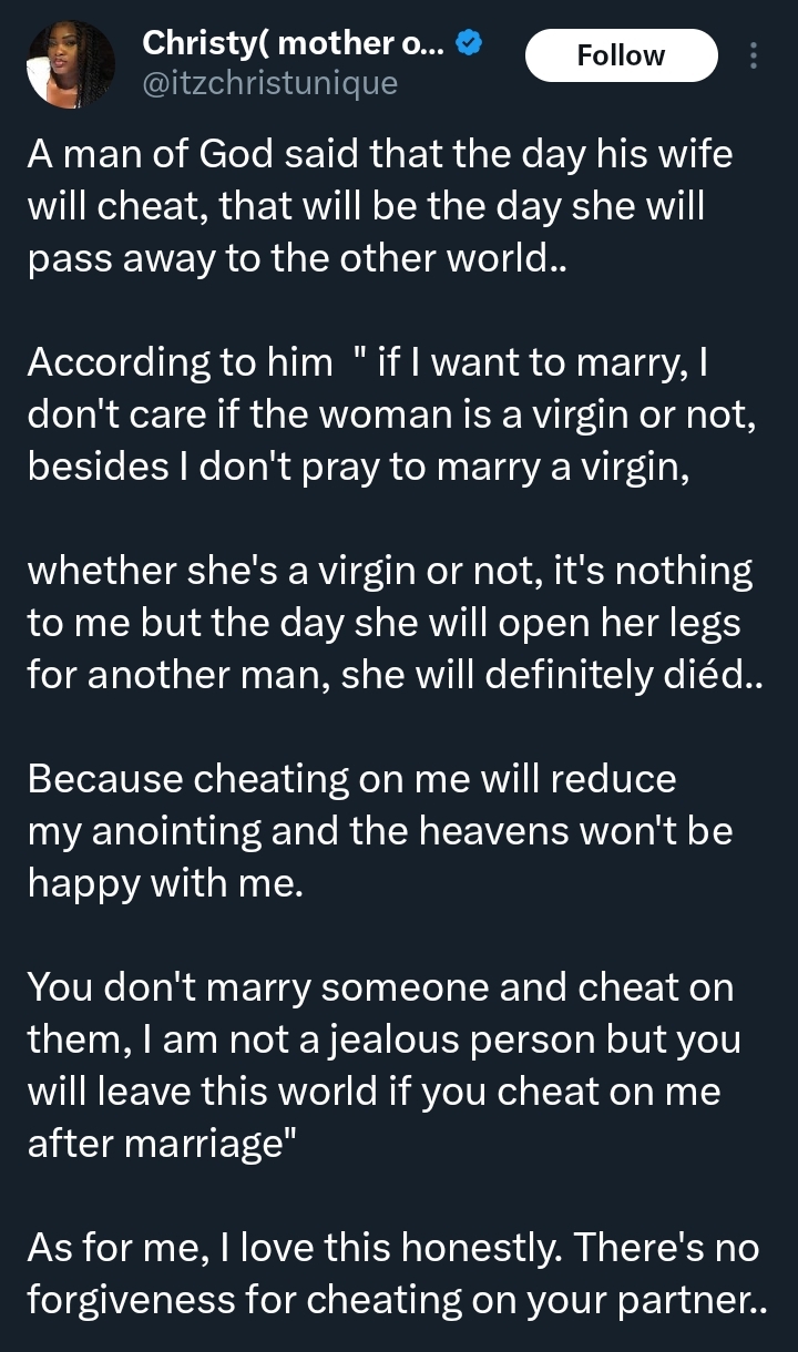 A Nigerian pastor has stirred debate online after making a strong statement about infidelity in marriage, declaring that his wife would not survive the day she cheats on him.