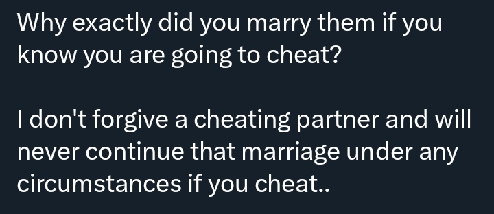 If someone marries knowing full well that they might cheat, it makes you question why they married in the first place. Loyalty and commitment aren’t optional, they’re the foundation.”