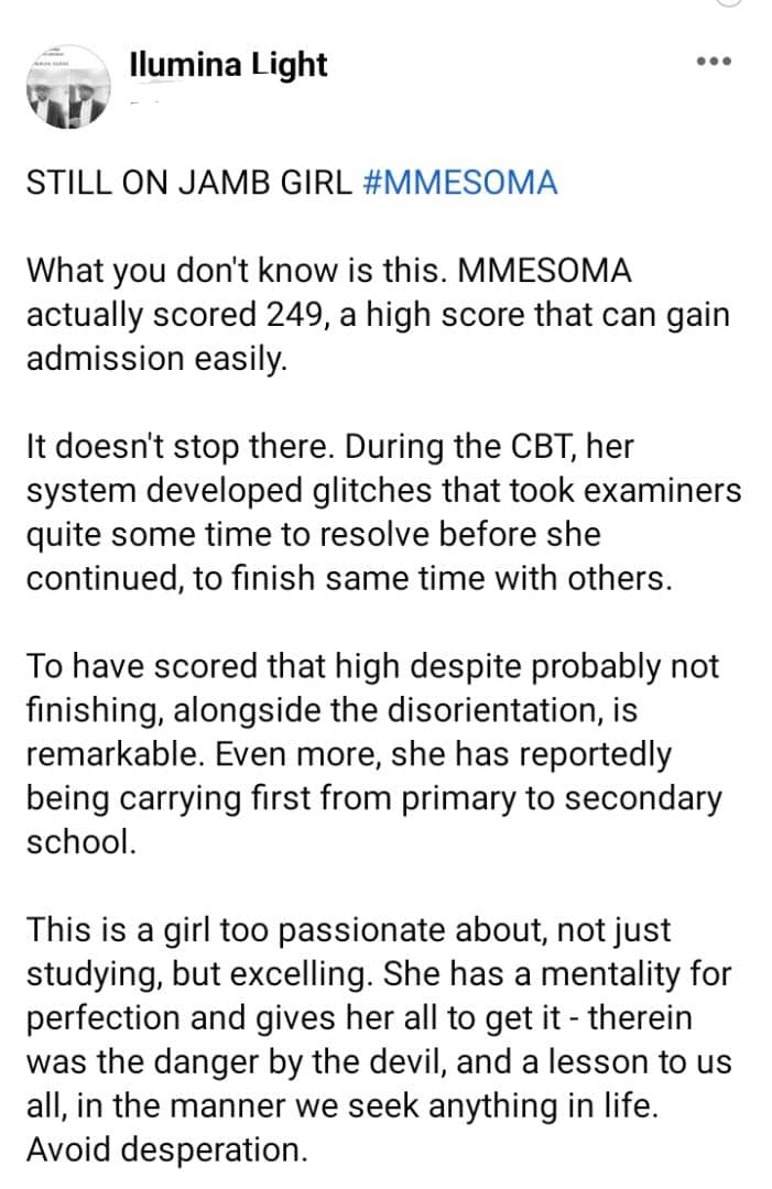 “What you don’t know is this. MMESOMA actually scored 249, a high score that can gain admission easily. It doesn’t stop there. During the CBT, her system developed glitches that took examiners quite some time to resolve before she continued, to finish same time with others.